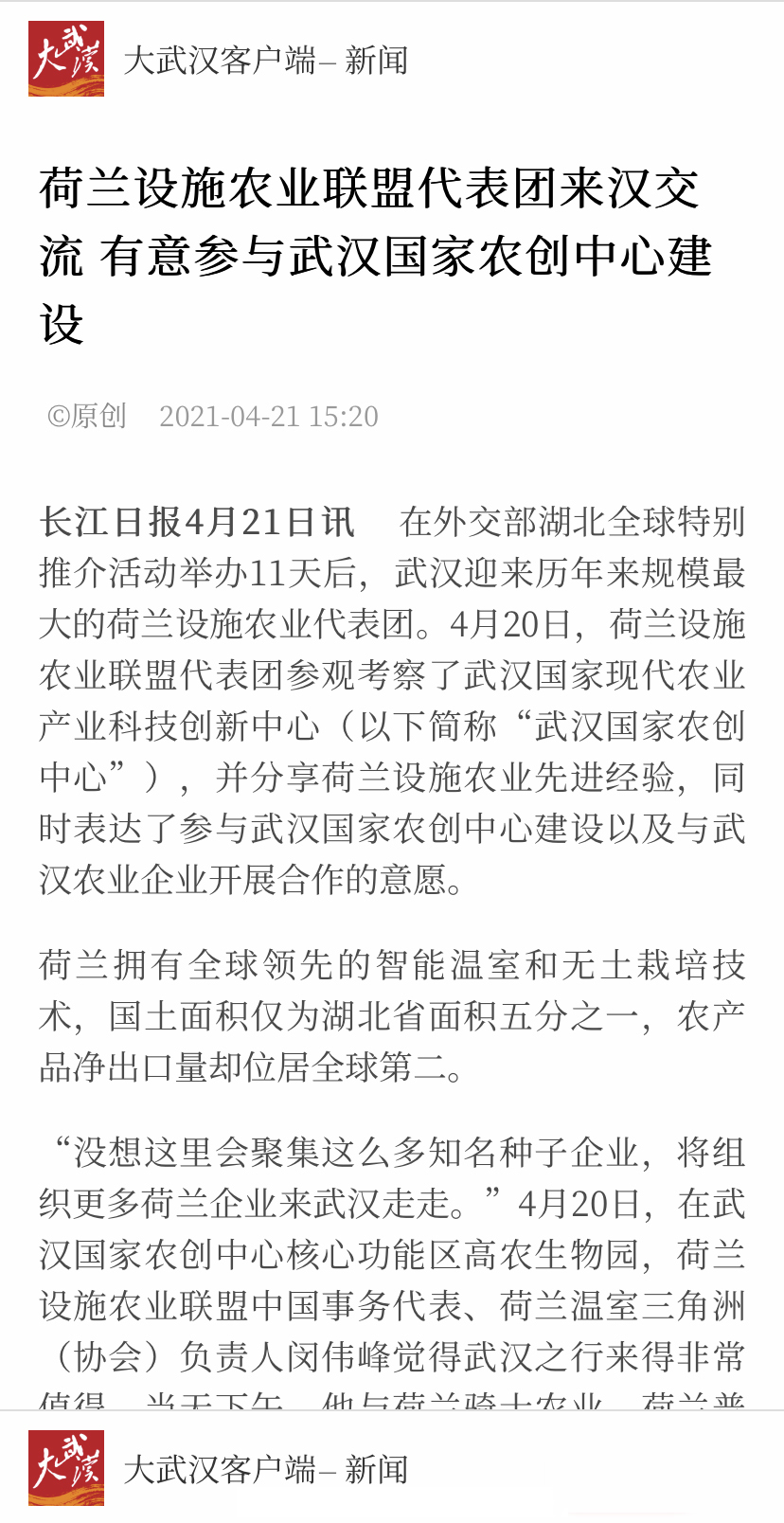 長(zhǎng)江日?qǐng)?bào)4月21日訊????在外交部湖北全球特別推介活動(dòng)舉辦11天后,武漢迎來(lái)歷年來(lái)規(guī)模最大的荷蘭設(shè)施農(nóng)業(yè)代表團(tuán)。4月20日,荷蘭設(shè)施農(nóng)業(yè)聯(lián)盟代表團(tuán)參觀考察了武漢國(guó)家現(xiàn)代農(nóng)業(yè)產(chǎn)業(yè)科技創(chuàng)新中心(以下簡(jiǎn)稱“武漢國(guó)家農(nóng)創(chuàng)中心”),并分享荷蘭設(shè)施農(nóng)業(yè)先進(jìn)經(jīng)驗(yàn),同時(shí)表達(dá)了參與武漢國(guó)家農(nóng)創(chuàng)中心建設(shè)以及與武漢農(nóng)業(yè)企業(yè)開(kāi)展合作的意愿。