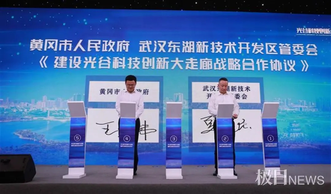 光谷黃岡科技產(chǎn)業(yè)園與武漢東湖高新區(qū)及武漢高科集團簽約,共建“黃岡(光谷)科技創(chuàng)新中心”。