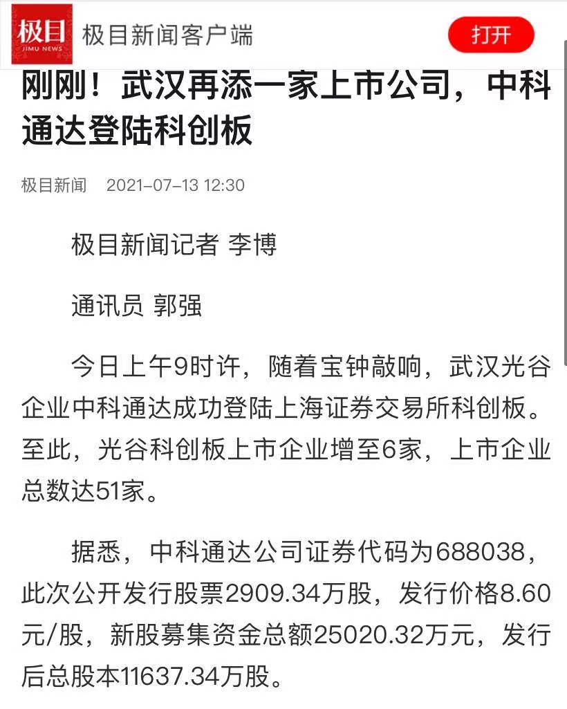 極目新聞客戶端:剛剛!武漢再添一家上市公司,中科通達(dá)登陸科創(chuàng)板