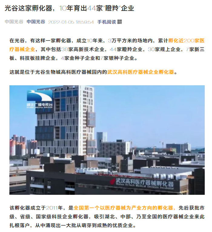 媒體關(guān)注:武漢高科醫(yī)療器械企業(yè)孵化器,十年育出44家瞪羚企業(yè)