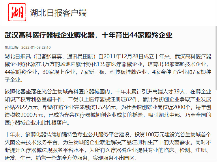 湖北日報:武漢高科醫(yī)療器械企業(yè)孵化器,十年育出44家瞪羚企業(yè)